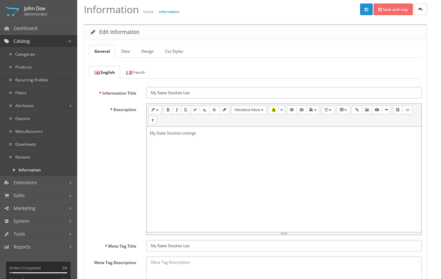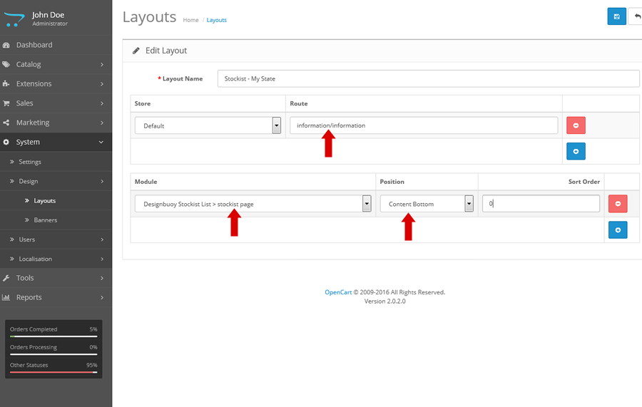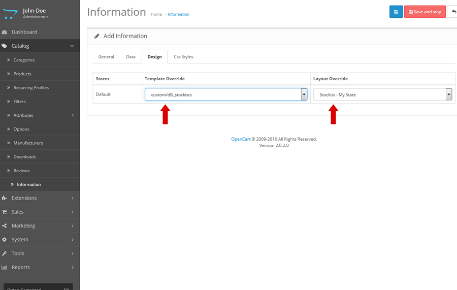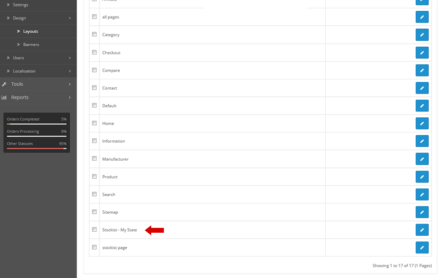 To add the Layout, go to the design tab and under Template Override choose Custom/dB_stockists and choose Layout Override to choose your new layout. Now your list will be applied to this page.
